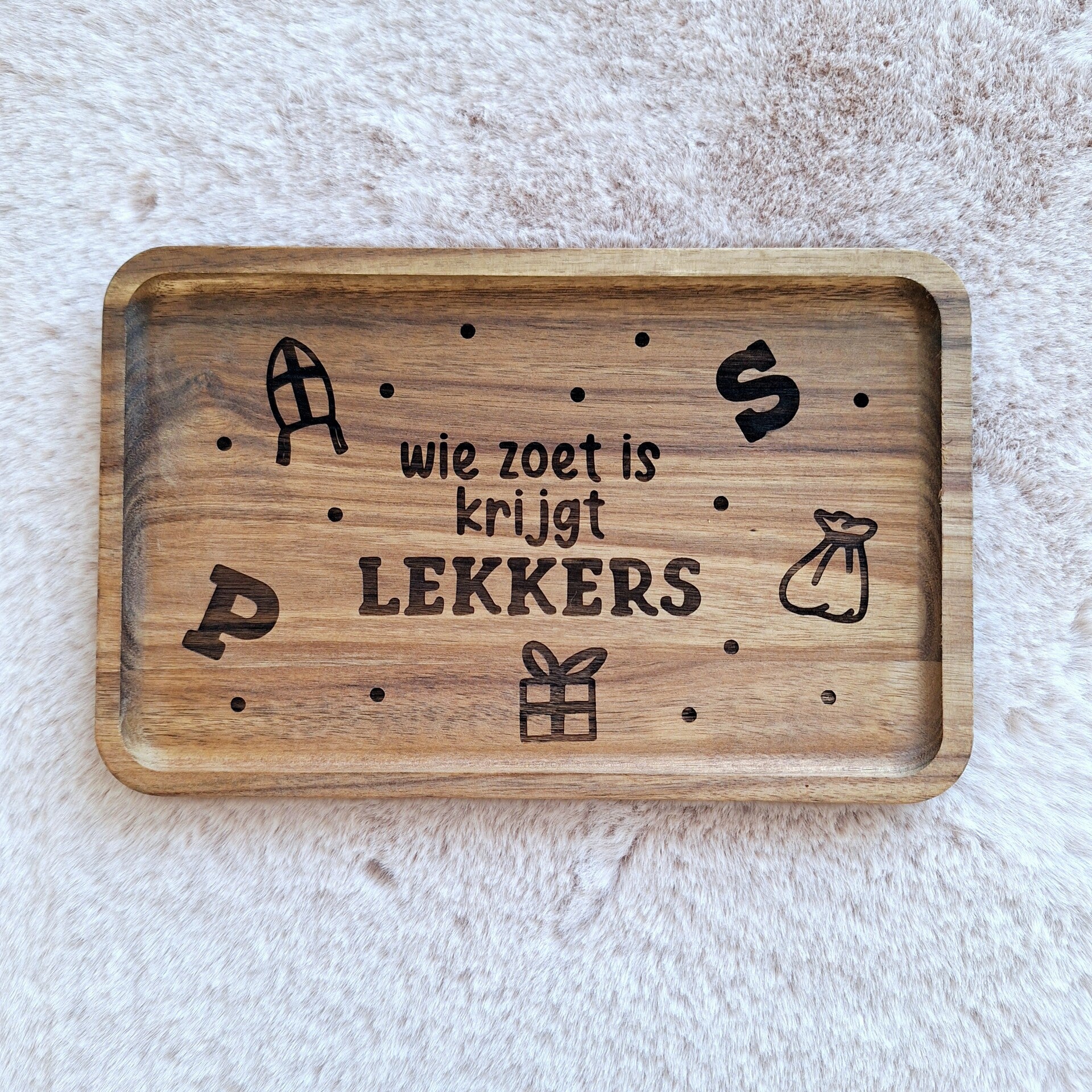 Maak de Sinterklaastijd nog specialer met dit Sinterklaas lekkers plankje, gegraveerd met de vrolijke tekst "Wie zoet is krijgt lekkers". Perfect voor het serveren van Sinterklaaslekkernijen zoals pepernoten, chocoladeletters of andere zoetigheden. Het plankje is een sfeervolle toevoeging voor je Sinterklaasviering of als cadeau voor de feestdagen.